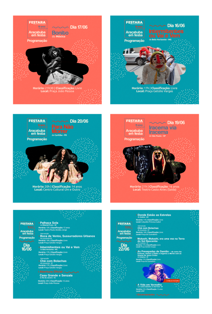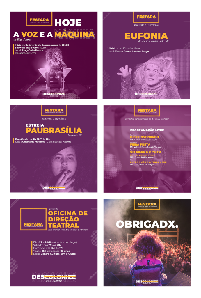 Artes para mídias sociais desenvolvidas para o Festival de Teatro de Araçatuba (2019)