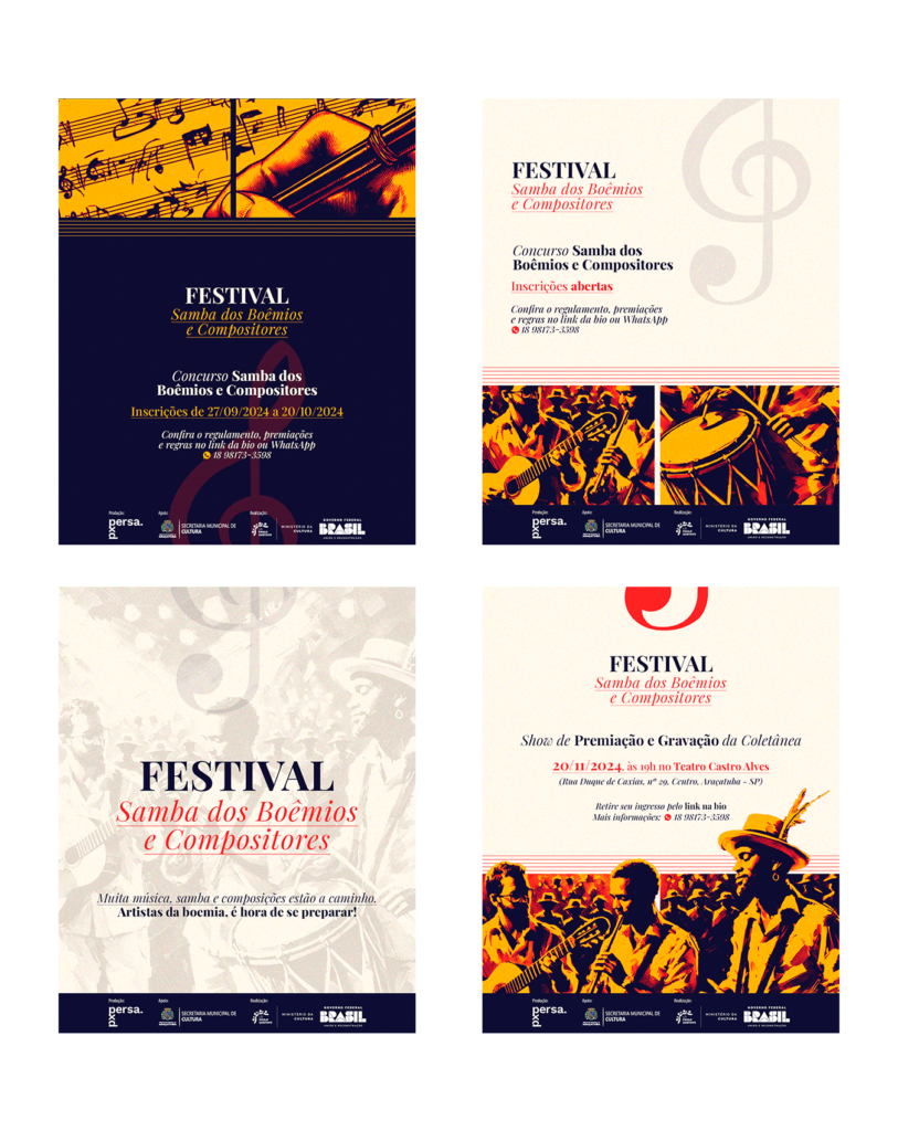 Artes para mídias sociais desenvolvidas para o Festival Samba dos Boêmios e Compositores (2024)